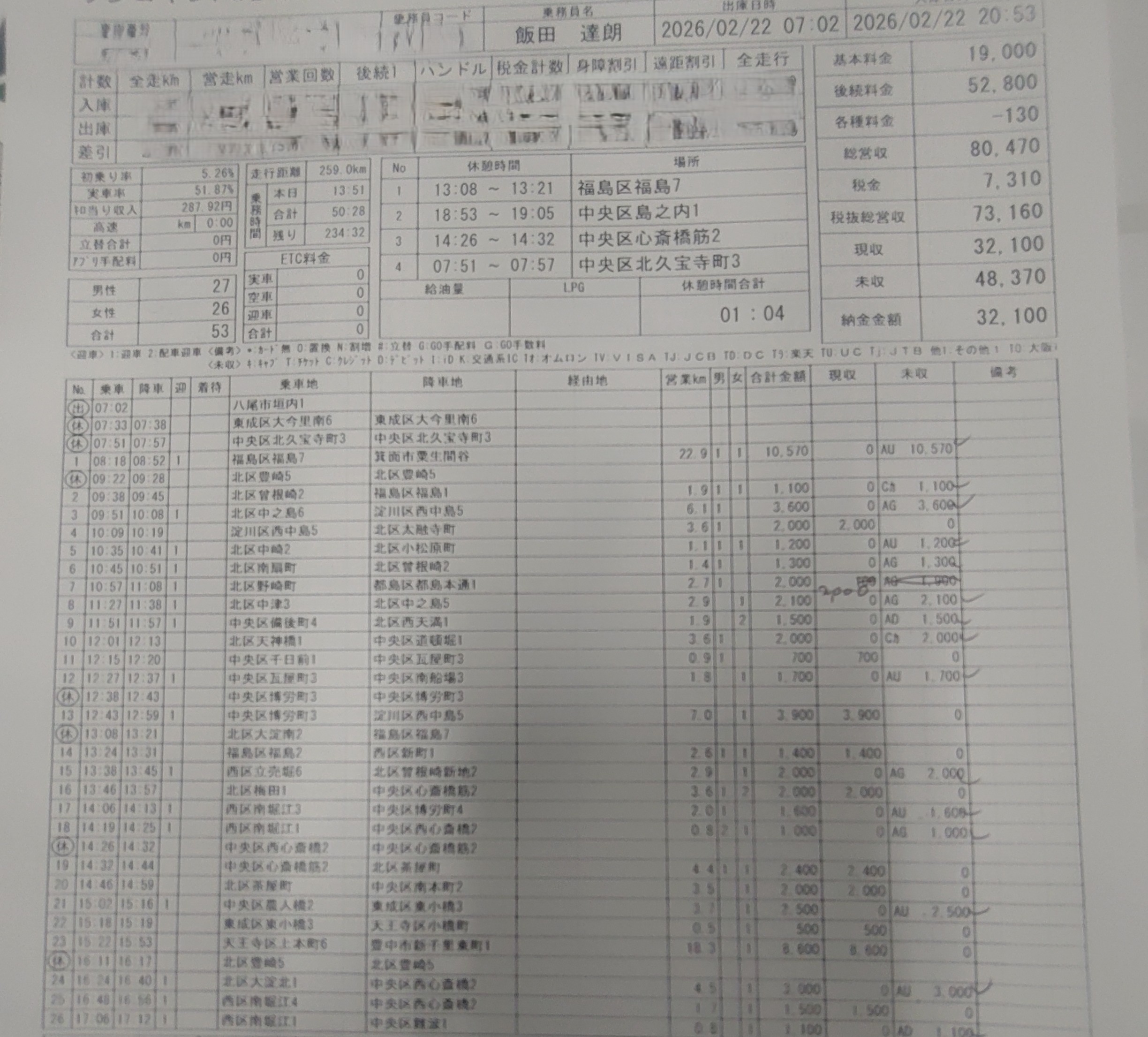 その後は、休憩時間を消化しつつということで、手上げの人も拾いやすく、アプリもいつも以上に鳴る状況で、最後は営業距離を気にしつつ早めに営業を切り上げました。